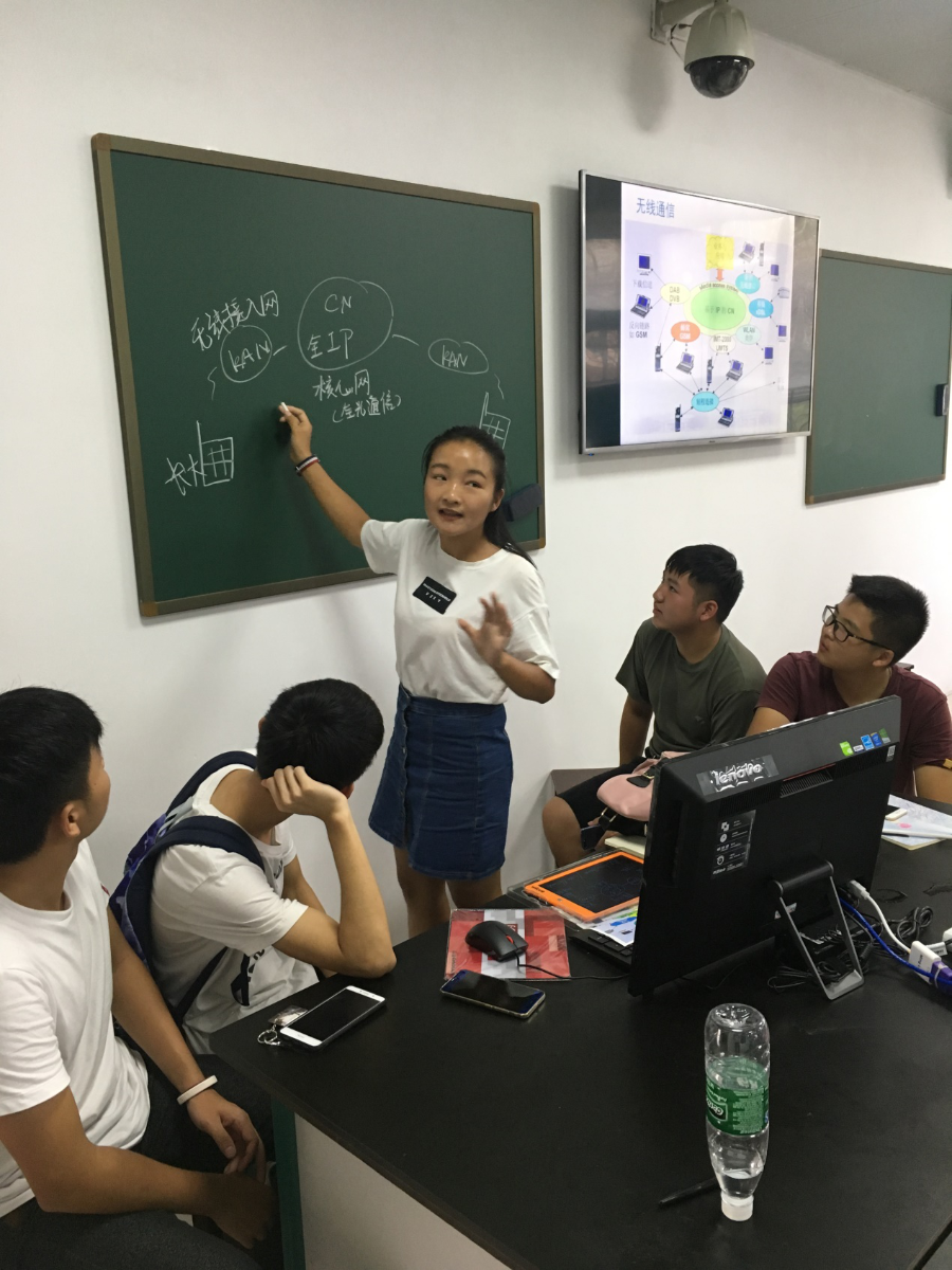 一年级新生进校的第一节专业教育课就与专业老师一起讨论前沿技术问题,甚至在大学课堂做颇有些学术含量的公开发言,对于新生的心理压力是显而易见的。所有的同学不仅需要提前调研本专题的知识点和关键技术,还需要在现场研讨过程中为“3分钟小组总结”积极出谋划策,商量如何用比较接地气的语言向其他组的同学阐述一个复杂的系统问题。通信1703班“微波天线”小组的代表同学使用微波炉加热有禁忌的生活常识,举例引出电磁波反射的科学知识。通信1701班“互联网络”小组的同学则利用工整的黑板板书配合本组对于技术需求的总结。通信1702班“无线通信”小组发言人在阐述一个概念的时候由于紧张,讲话有些磕巴,组里另一个同学马上主动站起来补充阐述了这个概念,体现了良好的团队协作精神。